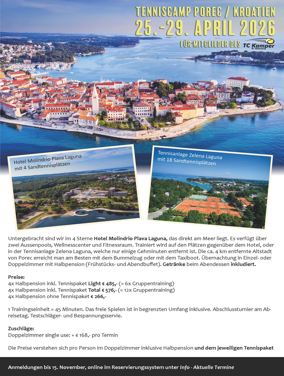 Tenniscamp für Vereinsmitglieder des TC Kamper in Porec/Kroatien.